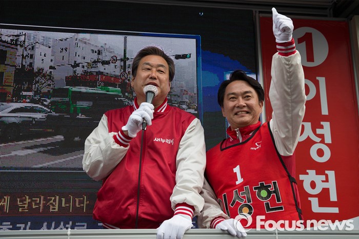 (서울=포커스뉴스) 20대 총선을 하루 앞둔 12일 오후 서울 마포구 신촌역 일대에서 김무성 새누리당 대표와 이성헌 서대문갑 후보가 선거유세를 하고 있다.