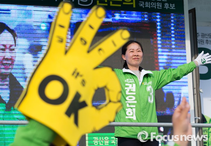 (광주=포커스뉴스) 4.13총선을 하루 앞둔 12일 오후 광주 광산구 타이어테크 수완점 앞에서 권은희 국민의당 광산구을 후보가 선거유세를 하고 있다.