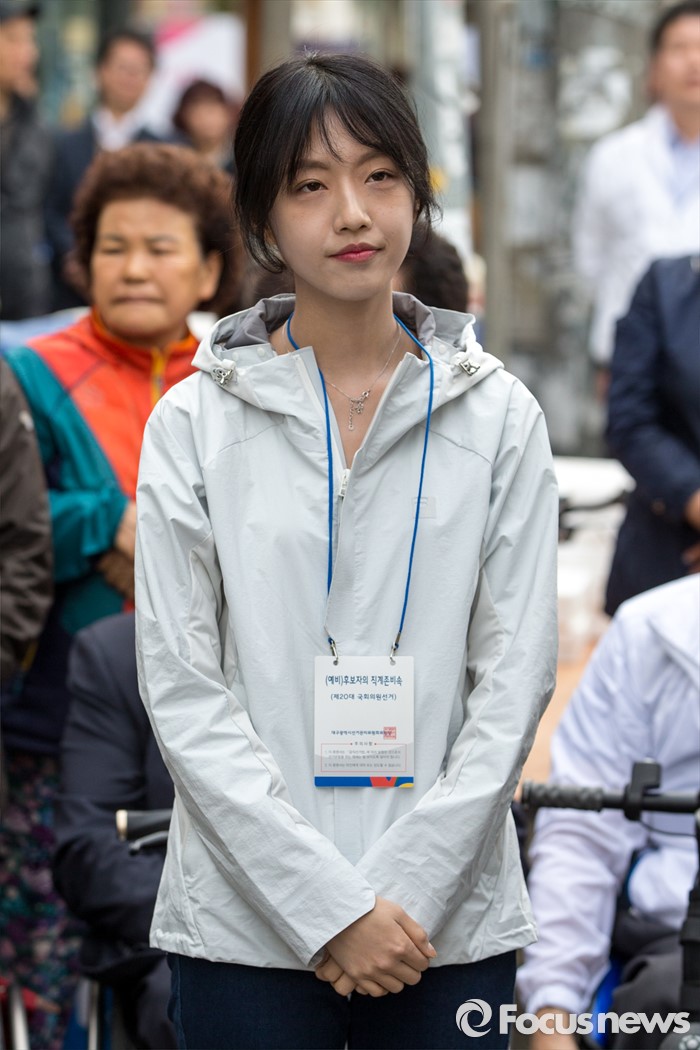 (대구=포커스뉴스) 12일 오후 대구광역시 동구 방촌시장에서 유승민 무소속 대구 동구을 후보 딸 유담 씨가 유 후보의 유세를 듣고 있다.