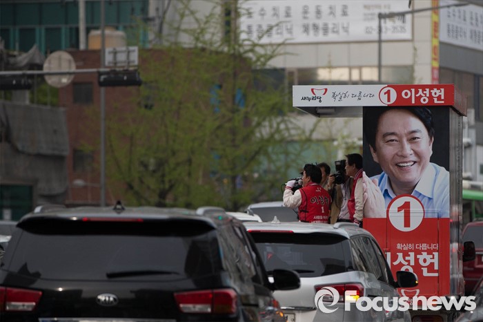 (서울=포커스뉴스) 20대 총선을 하루 앞둔 12일 오후 서울 마포구 신촌역 일대에서 김무성 새누리당 대표와 이성헌 서대문갑 후보가 선거유세를 하고 있다.