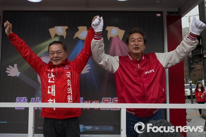 (서울=포커스뉴스) 20대 총선을 하루 앞둔 12일 오후 서울 용산구의 한 아파트 일대에서 김무성 새누리당 대표가 안대희 마포갑 후보 지원유세를 하고 있다.