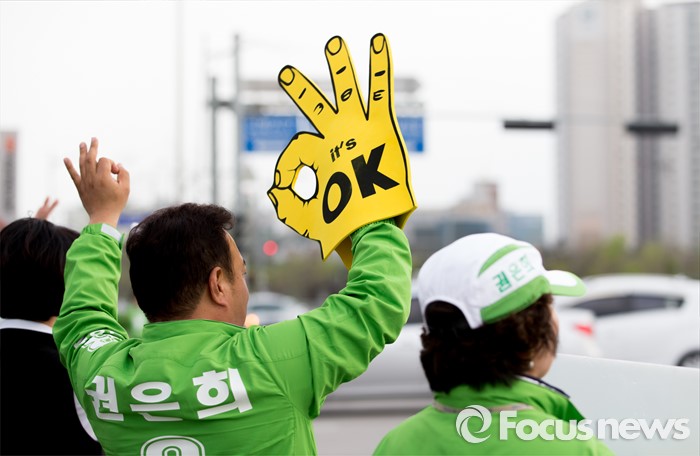 (광주=포커스뉴스) 4.13총선을 하루 앞둔 12일 오후 광주 광산구 타이어테크 수완점 앞에서 권은희 국민의당 광산구을 후보 선거운동원들이 지지를 호소하고 있다.