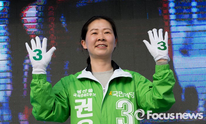 (광주=포커스뉴스) 4.13총선을 하루 앞둔 12일 오후 광주 광산구 타이어테크 수완점 앞에서 권은희 국민의당 광산구을 후보가 선거유세를 하고 있다.