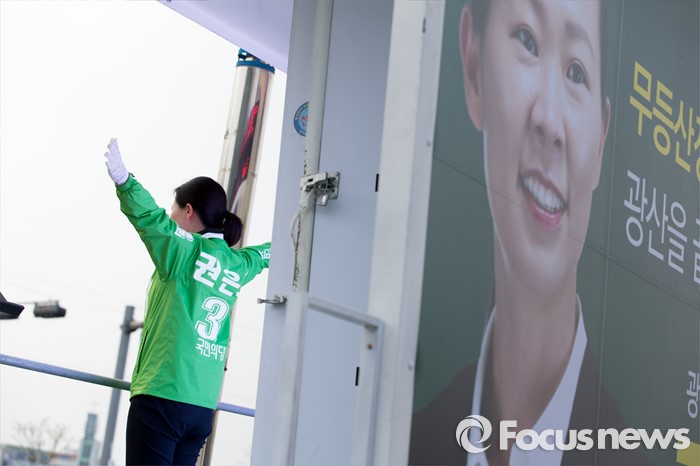 (광주=포커스뉴스) 4.13총선을 하루 앞둔 12일 오후 광주 광산구 타이어테크 수완점 앞에서 권은희 국민의당 광산구을 후보가 선거유세를 하고 있다.