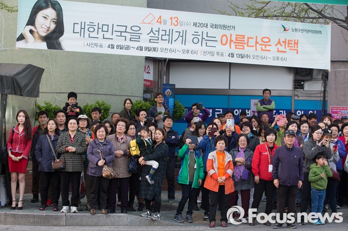 (서울=포커스뉴스) 12일 오후 서울 노원구 GS수퍼마켓 상계점 앞에서 시민들이 이준석 새누리당 노원병 후보자를 지지하는 김무성 새누리당 대표의 발언을 듣고 있다.