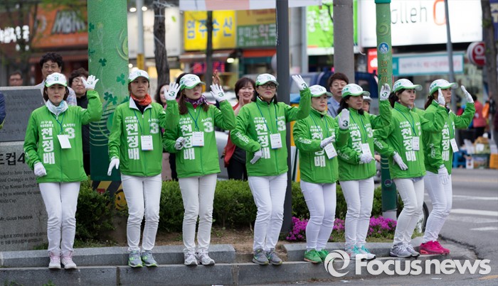 (광주=포커스뉴스) 4.13총선을 하루 앞둔 12일 오후 광주 서구 화정동 염주사거리에서 천정배 국민의당 광주 서구을 후보 선거운동원들이 지지를 호소하고 있다.
