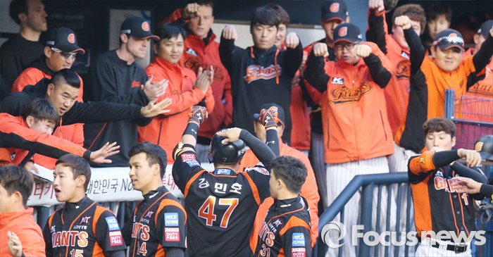 (서울=포커스뉴스) 12일 서울 잠실구장에서 열린 2016 프로야구 롯데-LG 경기 1회초 2사 2루에서 롯데 강민호가 좌월 2점 홈런을 치고 덕아웃에서 동료들의 환영을 받으며 세리머니를하고 있다.