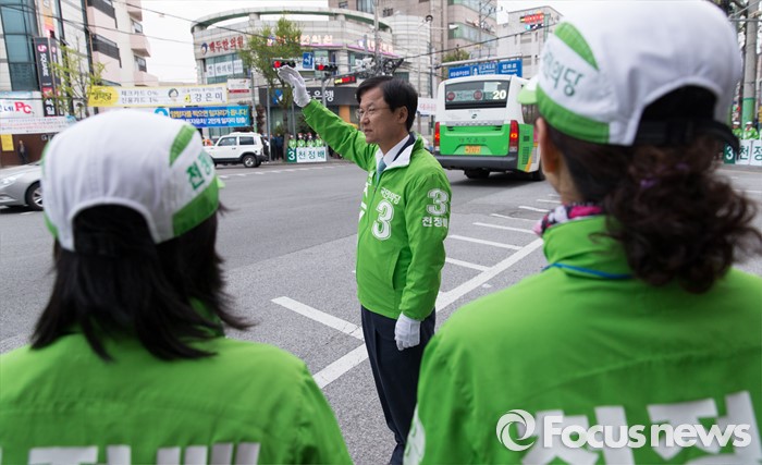 (광주=포커스뉴스) 4.13총선을 하루 앞둔 12일 오후 광주 서구 화정동 염주사거리에서 천정배 국민의당 광주 서구을 후보가 선거유세를 하고 있다.