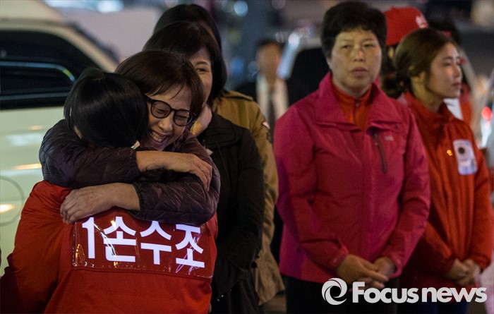 (부산=포커스뉴스) 4.13총선 선거운동 마지막날인 12일 오후 부산 사상구 엄궁초등학교 인근에서 손수조 새누리당 부산 사상구 후보가 지지자들과 포옹하고 있다.