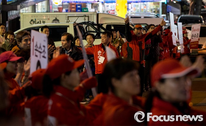 (부산=포커스뉴스) 4.13총선 선거운동 마지막날인 12일 오후 부산 사상구 엄궁초등학교 인근에서 손수조 새누리당 부산 사상구 후보의 지지자들이 손 후보를 향해 박수를 보내고 있다.