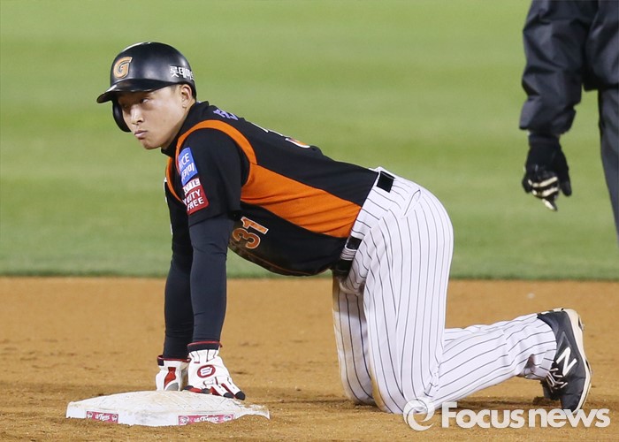 (서울=포커스뉴스) 12일 서울 잠실구장에서 열린 2016 프로야구 롯데-LG 경기 3회초 중견수앞 안타로 진루한 롯데 손아섭이 강민호 타석때 2루 도루를 시도하다 아웃된후 베이스를 잡고 엎드려 있다.