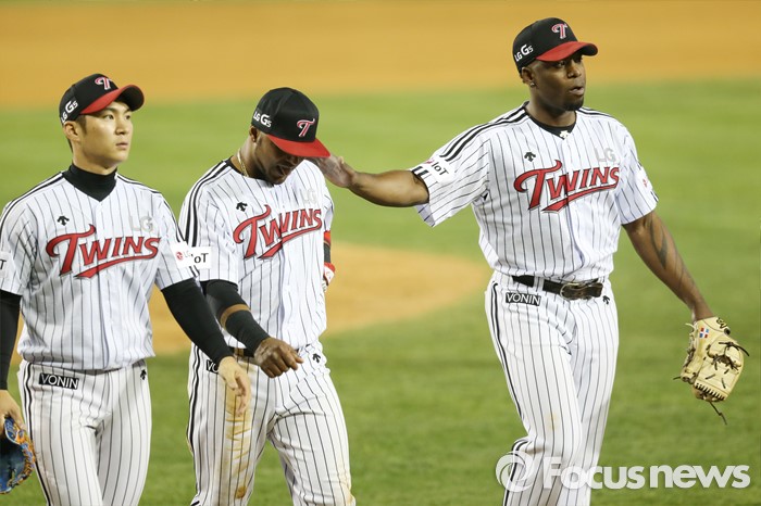 (서울=포커스뉴스) 12일 서울 잠실구장에서 열린 2016 프로야구 롯데-LG 경기 6회초 LG 투수 소사가 호수비를 한 히메네스의 어깨를 두드리며 격려하고 있다.