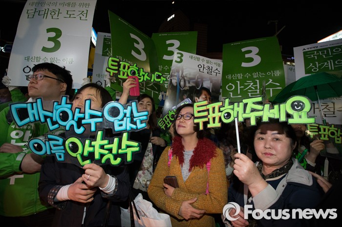 (서울=포커스뉴스) 4.13총선을 하루 앞둔 12일 오후 서울 노원구 롯데백화점 정문 앞에서 시민들이 안철수 국민의당 상임공동대표의 선거 유세를 지켜보고 있다.