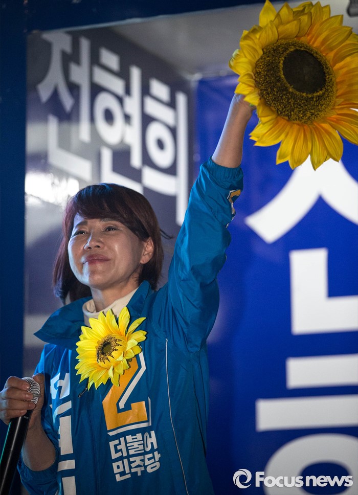 (서울=포커스뉴스) 공식 선거운동이 끝나는 12일 오후 서울 강남구 수서역 앞에서 전현희 더불어민주당 후보가 퇴근길 시민들을 향해 유세를 하고 있다.