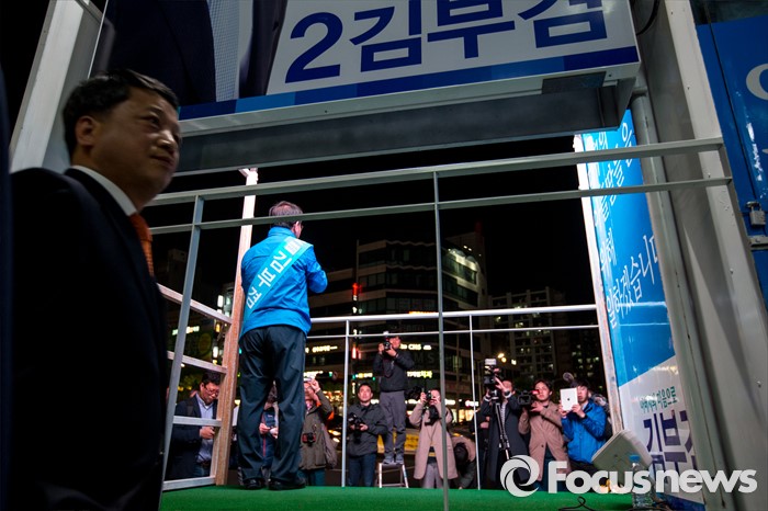 (대구=포커스뉴스) 김부겸 더불어민주당 수성구갑 후보가 12일 오후 대구광역시 수성구 신매네거리에서 유세를하며 유권자들에게 한 표를 호소 하고 있다.