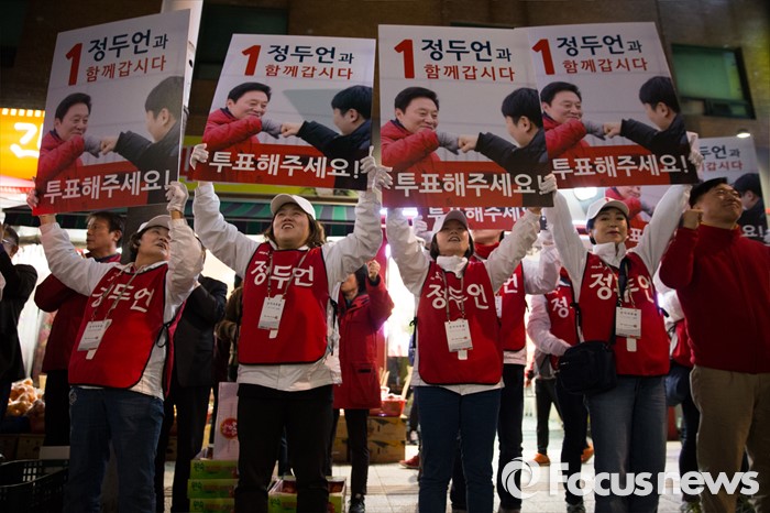 (서울=포커스뉴스) 제20대 국회의원 선거를 하루 앞둔 12일 오후 서울 은평구 증산역 앞에서 정두언 새누리당 서대문을 후보 선거운동원들이 구호를 외치고 있다.