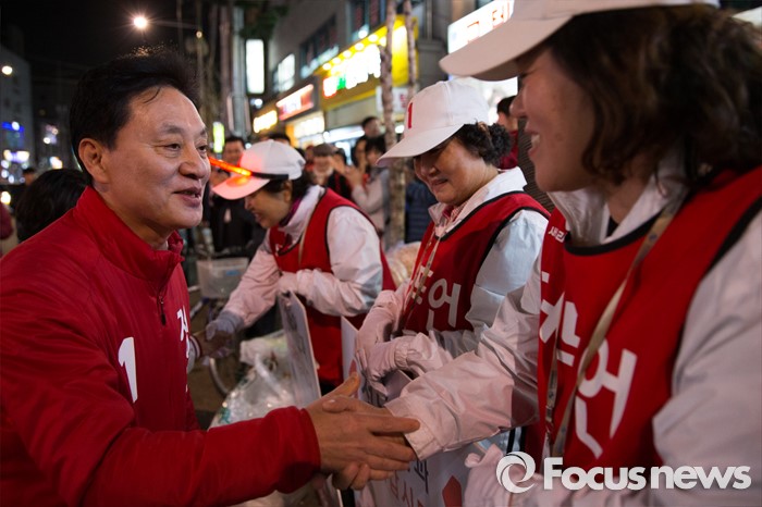 (서울=포커스뉴스) 제20대 국회의원 선거를 하루 앞둔 12일 오후 서울 은평구 증산역 앞에서 정두언 새누리당 서대문을 후보가 선거운동원들과 악수하고 있다.