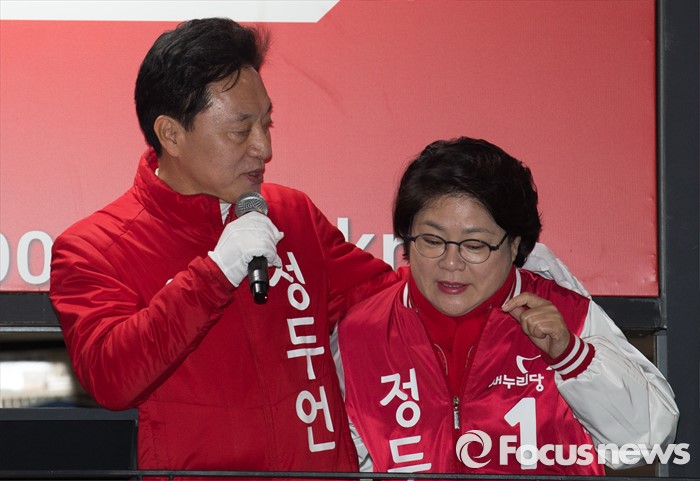 (서울=포커스뉴스) 제20대 국회의원 선거를 하루 앞둔 12일 오후 서울 은평구 증산역 앞에서 정두언 새누리당 서대문을 후보가 아내 이화익 씨에게 감사 인사를 하고 있다.