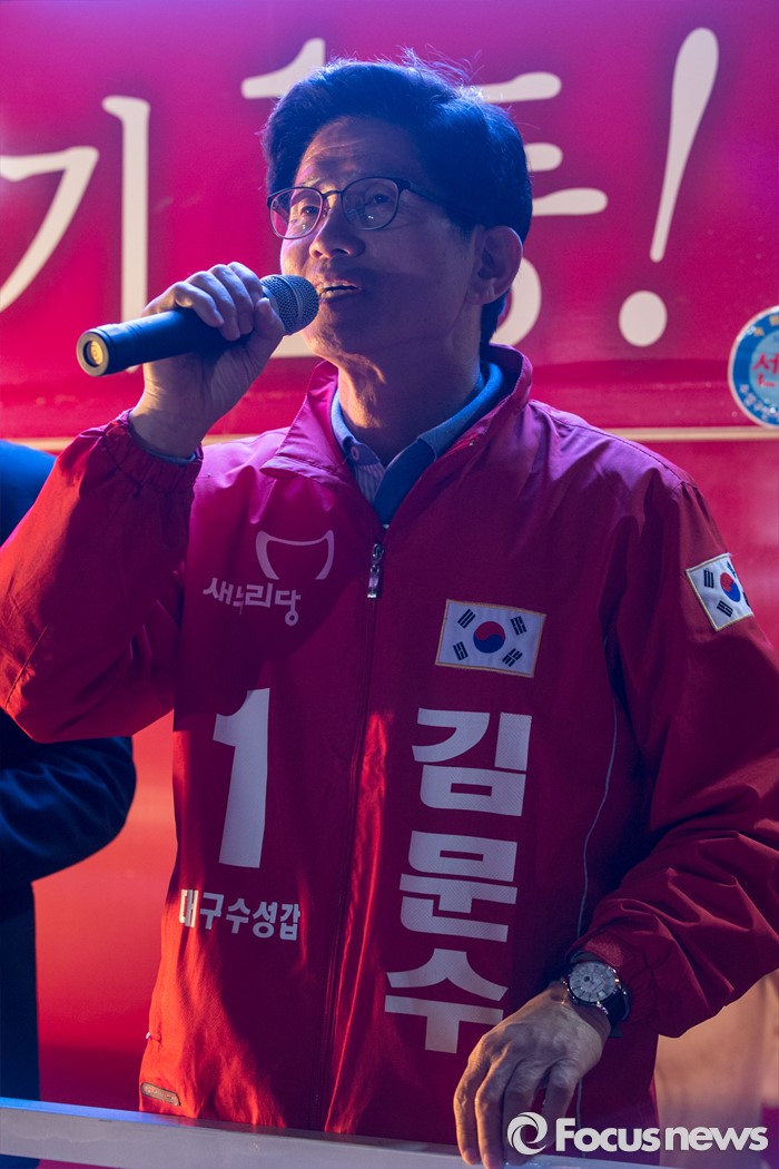 (대구=포커스뉴스) 김문수 새누리당 대구 수성구갑 후보가 12일 오후 대구광역시 수성구 신매광장에서 유세를하며 유권자들에게 한 표를 호소 하고 있다.