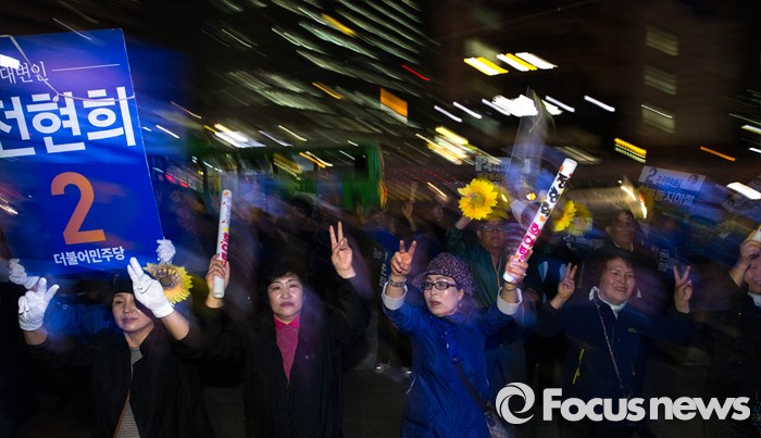 (서울=포커스뉴스) 공식 선거운동이 끝나는 12일 오후 서울 강남구 수서역 앞에서 전현희 더불어민주당 후보와 자원봉사자들이 퇴근길 시민들을 향해 유세를 하고 있다.