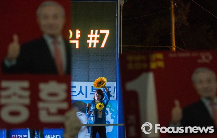 (서울=포커스뉴스) 공식 선거운동이 끝나는 12일 오후 서울 강남구 수서역 앞에서 전현희 더불어민주당 후보가 퇴근길 시민들을 향해 유세를 하고 있다.