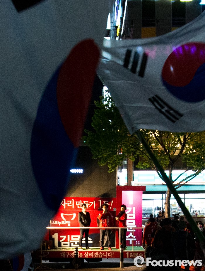 (대구=포커스뉴스) 김문수 새누리당 대구 수성구갑 후보가 12일 오후 대구광역시 수성구 신매광장에서 유세를하며 유권자들에게 한 표를 호소 하고 있다.