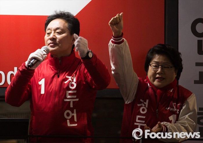 (서울=포커스뉴스) 제20대 국회의원 선거를 하루 앞둔 12일 오후 서울 은평구 증산역 앞에서 정두언 새누리당 서대문을 후보가 로고송을 부르며 지지호소 하고 있다. 왼쪽은 아내 이화익 씨.