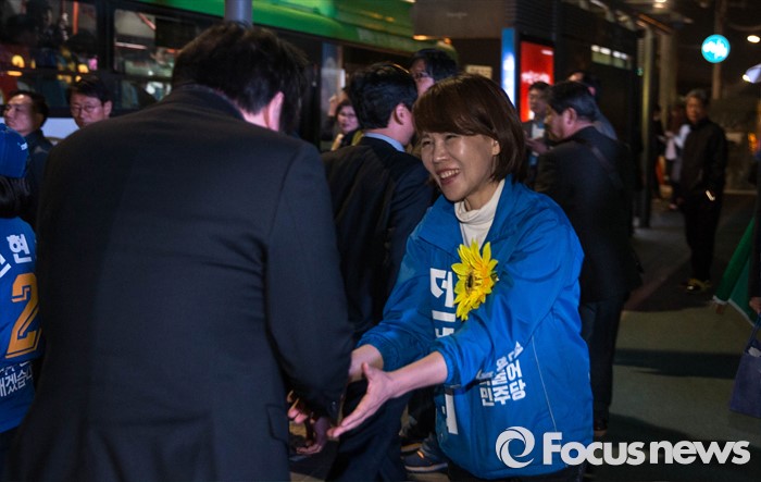 (서울=포커스뉴스) 공식 선거운동이 끝나는 12일 오후 서울 강남구 수서역 앞에서 전현희 더불어민주당 후보가 퇴근길 시민들을 향해 유세를 하고 있다.