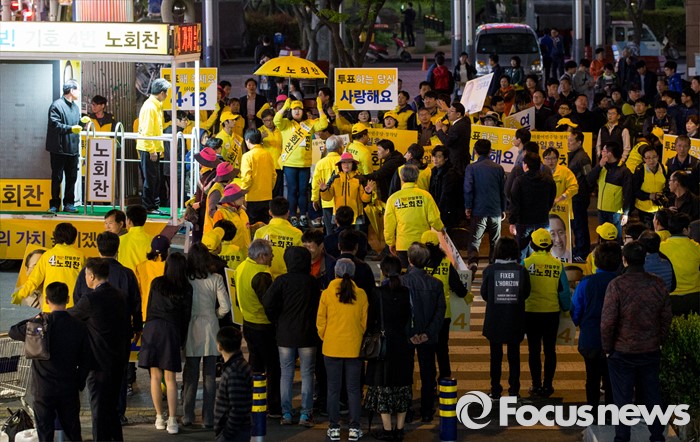 (창원=포커스뉴스) 4.13총선 선거운동 마지막날인 12일 오후 경남 창원시 상남분수광장에서 열린 노회찬 정의당 창원 성산구 후보 선거유세에 참석한 노 후보 지지자들이 손팻말을 흔들고 있다.