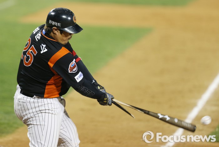 (서울=포커스뉴스) 12일 서울 잠실구장에서 열린 2016 프로야구 롯데-LG 경기 7회초 2사 2루에서 롯데 최준석이 중견수앞 안타를 치고 있다.