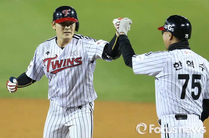 (서울=포커스뉴스) 12일 서울 잠실구장에서 열린 2016 프로야구 롯데-LG 경기 7회말 1사 2,3루에서 LG 이형종이 중경수 오른쪽에 떨어지는 2타점 안타를 치고 1루에서 한혁수 코치와 주먹을 마주치고 있다.