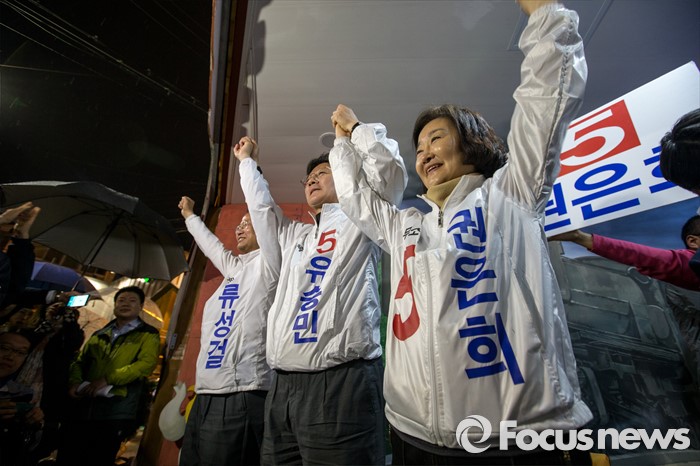 (대구=포커스뉴스) 권은희(오른쪽부터) 무소속 대구 북구갑 후보, 유승민 무소속 대구 동구을 후보, 류성걸 대구 동구갑 후보가 12일 오후 대구광역시 동구 평화시장 닭똥집골목에서 마무리 합동유세를 하며 손을 맞잡고 지지자들에게 인사하고 있다.