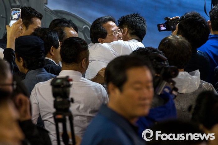 (대구=포커스뉴스) 류성걸 무소속 대구 동구갑 후보가 12일 오후 대구광역시 동구 평화시장 닭똥집골목에서 마무리 합동유세를 마친 뒤 지지자와 포옹 하고 있다.