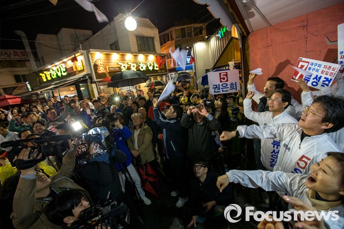 (대구=포커스뉴스) 권은희(오른쪽부터) 무소속 대구 북구갑 후보, 유승민 무소속 대구 동구을 후보, 류성걸 대구 동구갑 후보를 비롯한 지지자들이 12일 오후 대구광역시 동구 평화시장 닭똥집골목에서 마무리 합동유세를 마친 뒤 각자 희망을 담은 종이비행기를 날리고 있다.