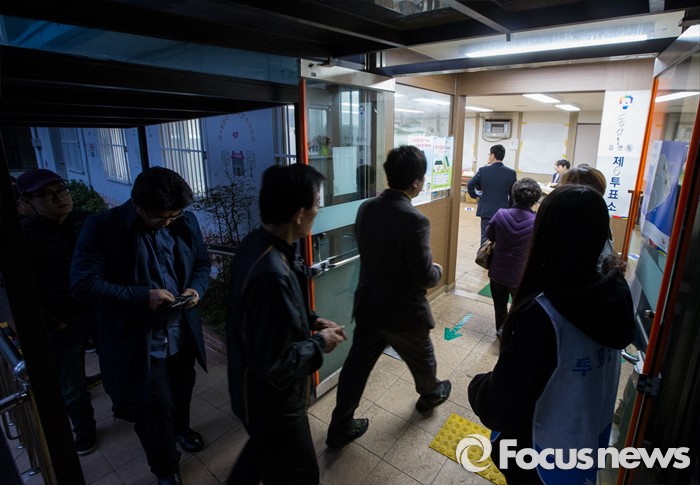 (부산=포커스뉴스) 제20대 국회의원선거일인 13일 오전 부산 영도구 동삼1동 제6투표소에서 유권자들이 투표 시작을 기다리고 있다.