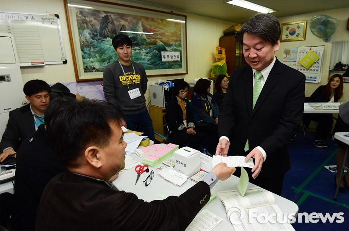 (서울=포커스뉴스) 안철수 국민의당 상임공동대표가 제20대 국회의원선거날인 13일 서울 노원구 상계1동 제7투표소에서 투표용지를 받고 있다.