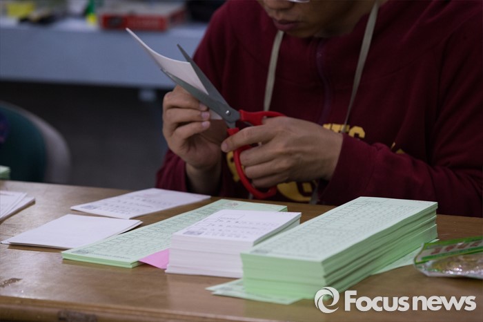 (서울=포커스뉴스) 제20대 국회의원선거일인 13일 오전 서울 서대문구 뉴헤어미용실에 위치한 홍은제2동 제2투표소에서 투표사무원이 투표용지를 정리하고 있다.