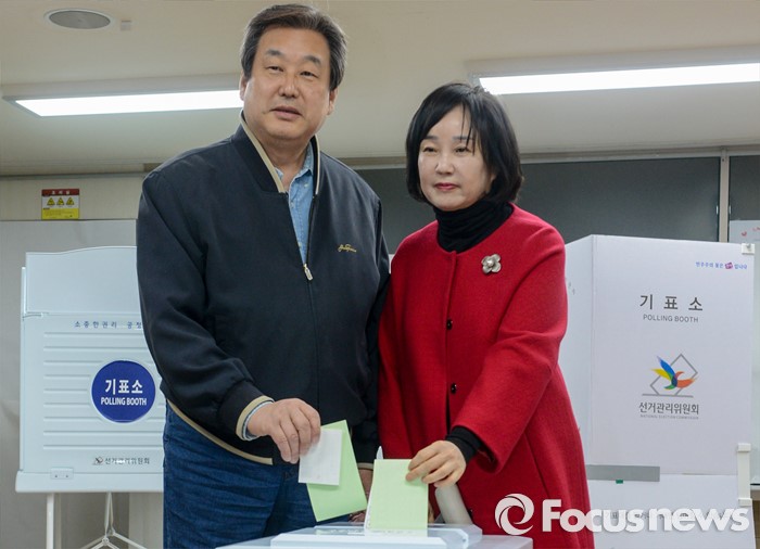 (부산=포커스뉴스) 제20대 국회의원선거일인 13일 오전 부산 영도구 동삼1동 제6투표소에서 김무성 새누리당 대표와 부인 최양옥 씨가 투표하고 있다.