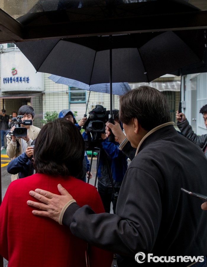 (부산=포커스뉴스) 제20대 국회의원선거일인 13일 오전 부산 영도구 동삼1동 제6투표소에서 김무성 새누리당 대표와 아내 최양옥 씨가 투표를 마친 후 차량으로 향하고 있다.