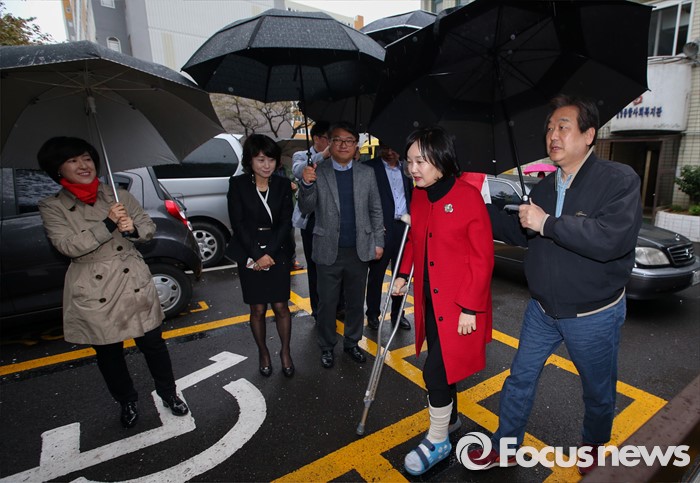 (부산=포커스뉴스) 제20대 국회의원선거일인 13일 오전 부산 영도구 동삼1동 제6투표소로 김무성 새누리당 대표와 부인 최양옥 씨가 향하고 있다.