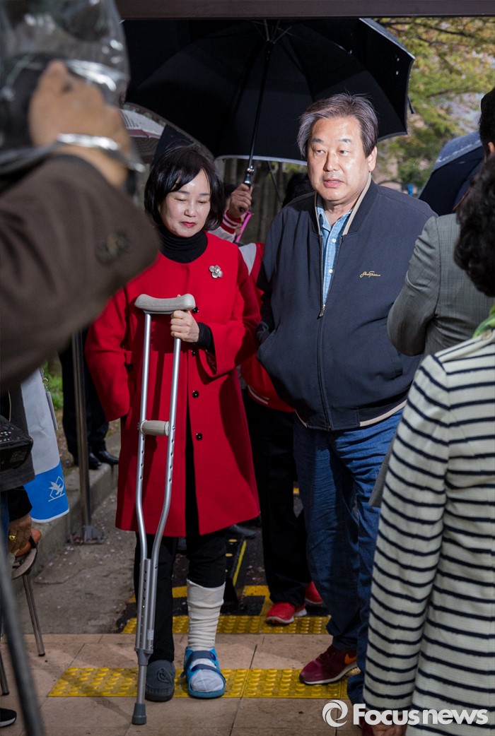 (부산=포커스뉴스) 제20대 국회의원선거일인 13일 오전 부산 영도구 동삼1동 제6투표소에 김무성 새누리당 대표와 아내 최양옥 씨가 들어서고 있다.