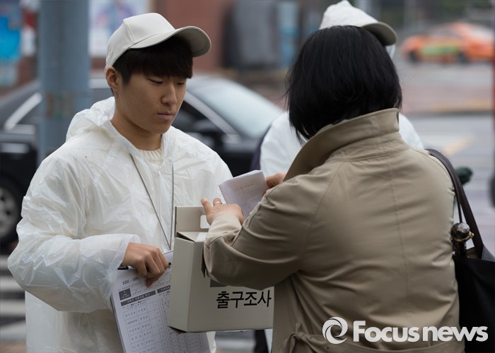 (서울=포커스뉴스) 2016 제20대 국회의원선거날인 13일 오전 서울 종로구 동성고등학교 백주년기념관에 설치된 투표소에서 유권자들이 투표를 마치고 나오던중 출구조사에 응하고 있다.