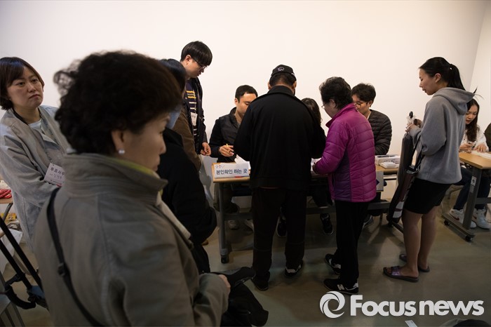 (서울=포커스뉴스) 2016 제20대 국회의원선거날인 13일 오전 서울 종로구 동성고등학교 백주년기념관에 설치된 투표소에서 유권자들이 투표를 하기 위해 본인확인을 하고 있다.