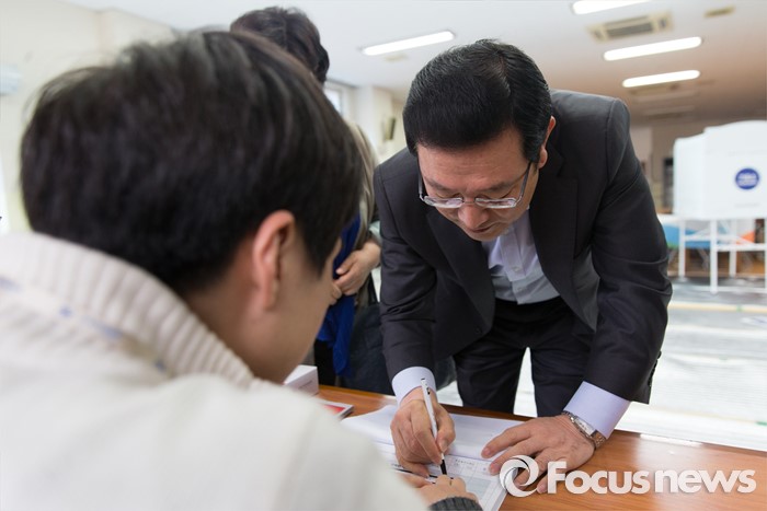 (광주=포커스뉴스) 제20대 국회의원 선거일인 13일 오전 광주 광산구 산월동 봉산초등학교에서 이용섭 더불어민주당 광주 광산구을 후보가 투표인 명부를 확인하고 있다.