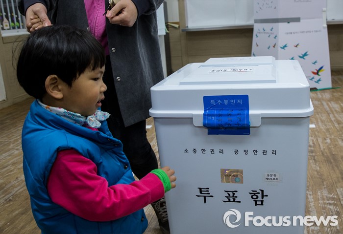 (부산=포커스뉴스) 제20대 국회의원선거일인 13일 오전 부산 영도구 동삼1동 제6투표소에서 한 어린이가 투표함을 바라보고 있다.