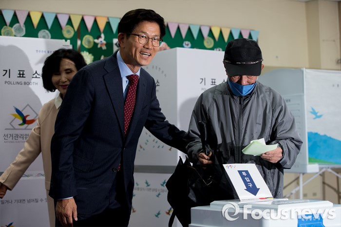 (대구=포커스뉴스) 제20대 국회의원선거날인 13일 오전 대구 수성구 청림초등학교에 마련된 투표소에서 김문수 새누리당 대구 수성구갑 후보가 투표를 하고 있다.