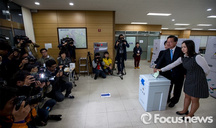 (대구=포커스뉴스) 제20대 국회의원선거날인 13일 오전 대구 수성구 만촌주민센터에 마련된 투표소에서 김부겸 더불어민주당 대구 수성갑 후보가 투표를 하고 있다.