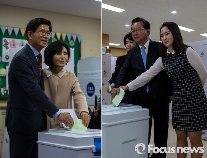 (대구=포커스뉴스) 제20대 국회의원선거날인 13일 오전 대구 수성구에 마련된 투표소에서 김문수(왼쪽) 새누리당 대구 수성구갑 후보와 김부겸 더불어민주당 대구 수성갑 후보가 투표를 하고 있다.