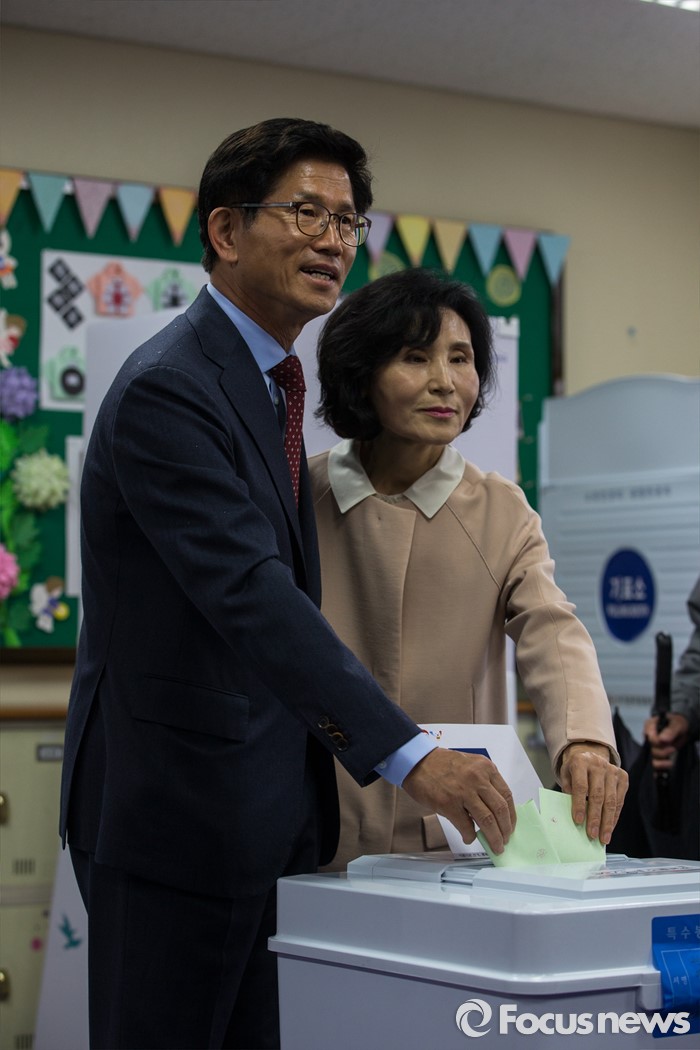 (대구=포커스뉴스) 제20대 국회의원선거날인 13일 오전 대구 수성구 청림초등학교에 마련된 투표소에서 김문수 새누리당 대구 수성구갑 후보가 투표를 하고 있다.