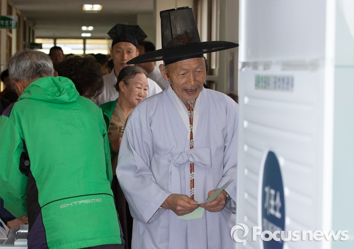 (논산=포커스뉴스) 제20대 국회의원 선거가 시작된 13일 오전 충남 논산 연산면 제1투표소에서 양지서당 유복엽 큰 훈장과 가족들이 투표하고 있다.